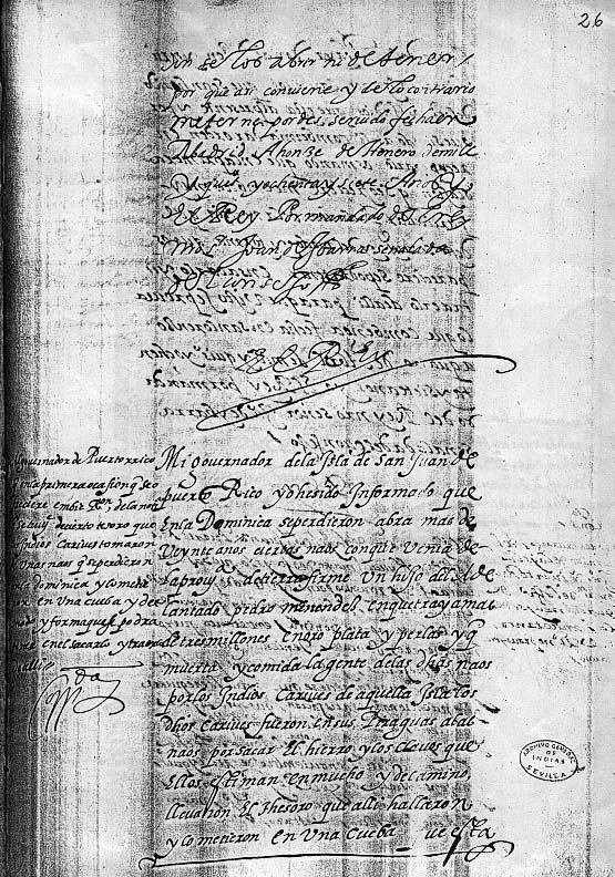 Arrivent alors simultanément jusqu'au Conseil des Indes les dépositions de deux témoins oculaires, anciens prisonniers des Caraïbes et qui affirment qu'il s'y trouve une grotte remplie d'or, d'argent et de bijoux.